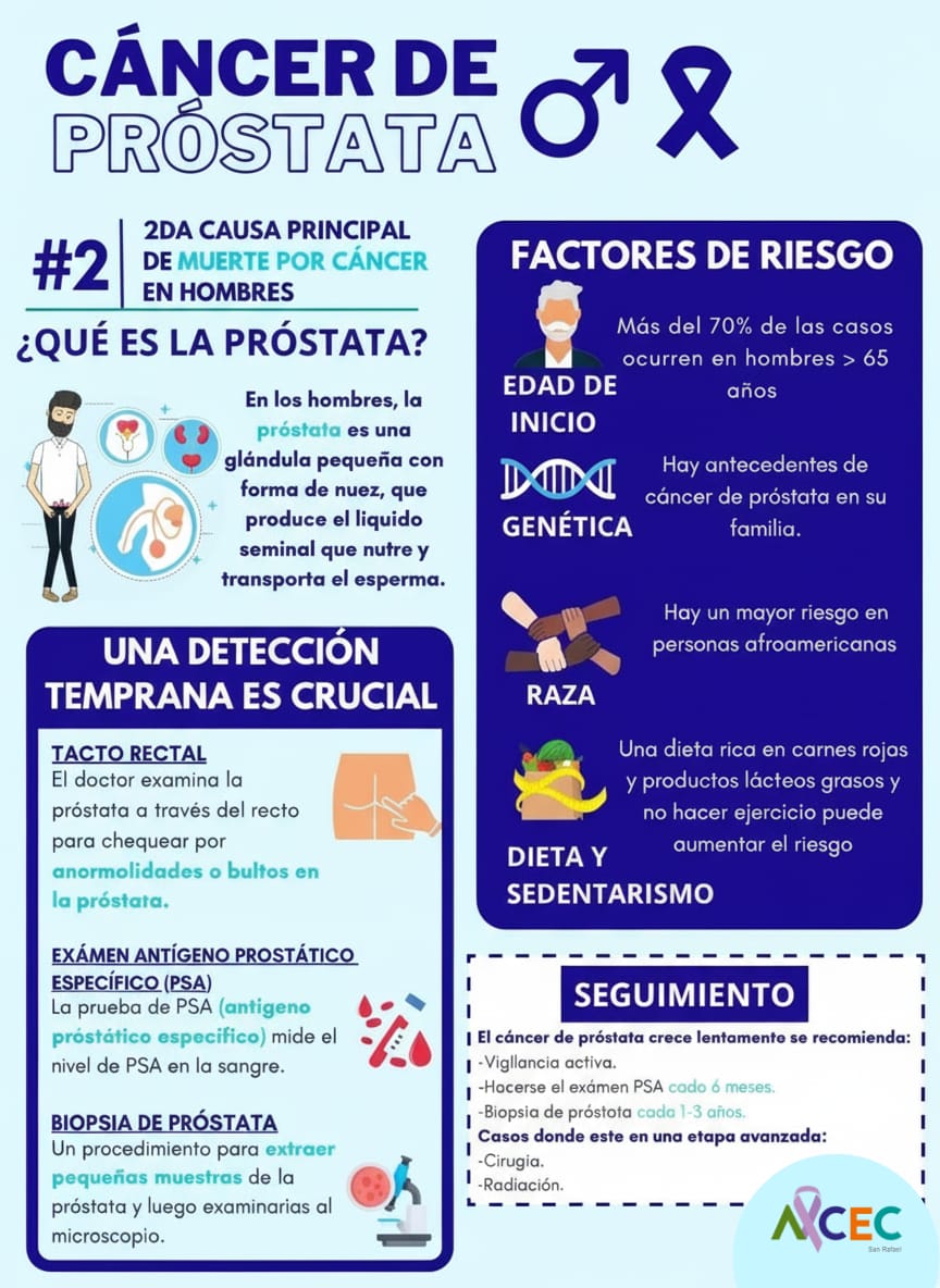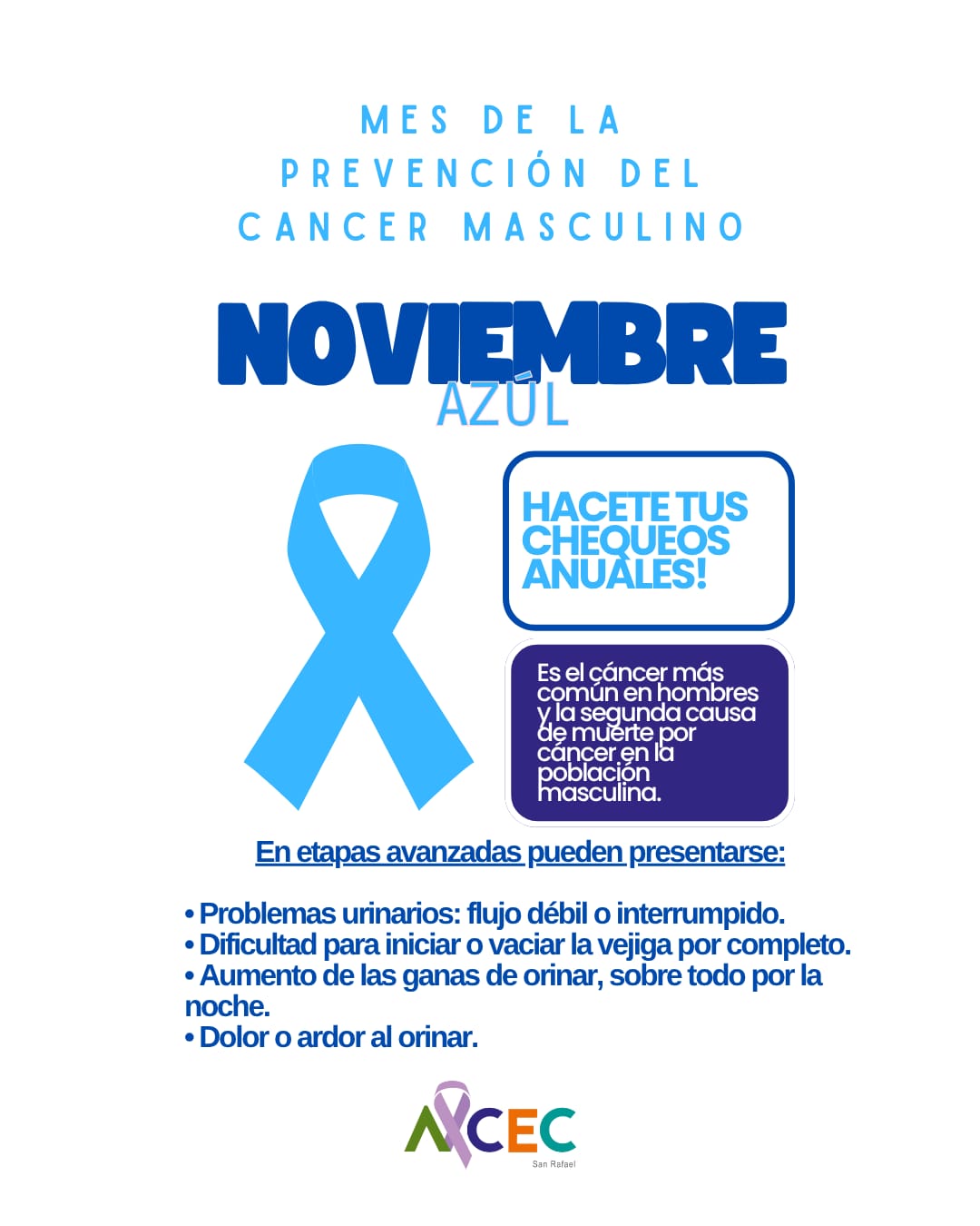 Noviembre (Azul) es el mes dedicado a la concientización y prevención del cáncer de próstata y otras enfermedades que afectan específicamente a la salud masculina. La Asociación de Lucha Contra el Cáncer (ALCEC) San Rafael busca promover el cuidado, la consulta médica temprana y la importancia de los chequeos anuales para la detección precoz.