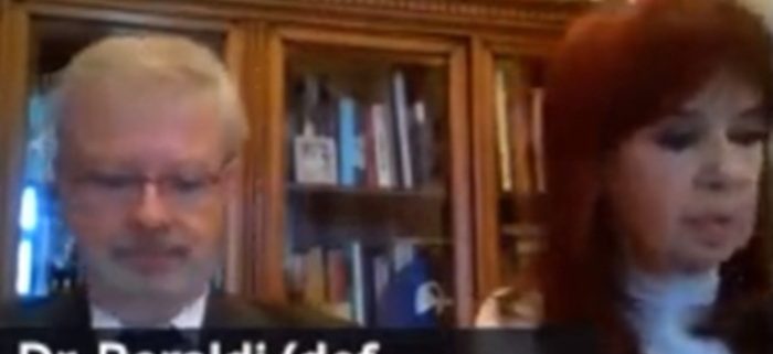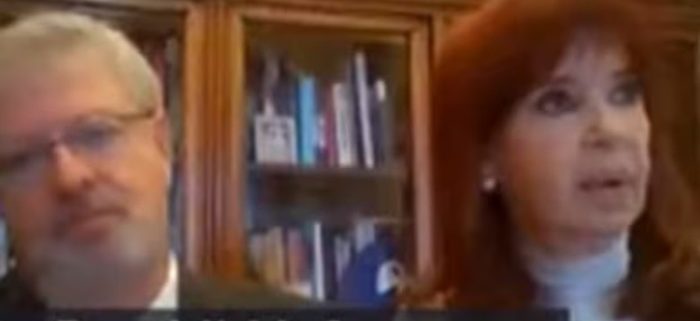 Tras la advertencia del juez, el abogado Alberto Beraldi cambió el encuadre de su cámara y Cristina Kirchner apareció sentada a su lado, con una polera blanca y un saco oscuro.