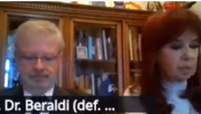 Tras la advertencia del juez, el abogado Alberto Beraldi cambió el encuadre de su cámara y Cristina Kirchner apareció sentada a su lado, con una polera blanca y un saco oscuro.
