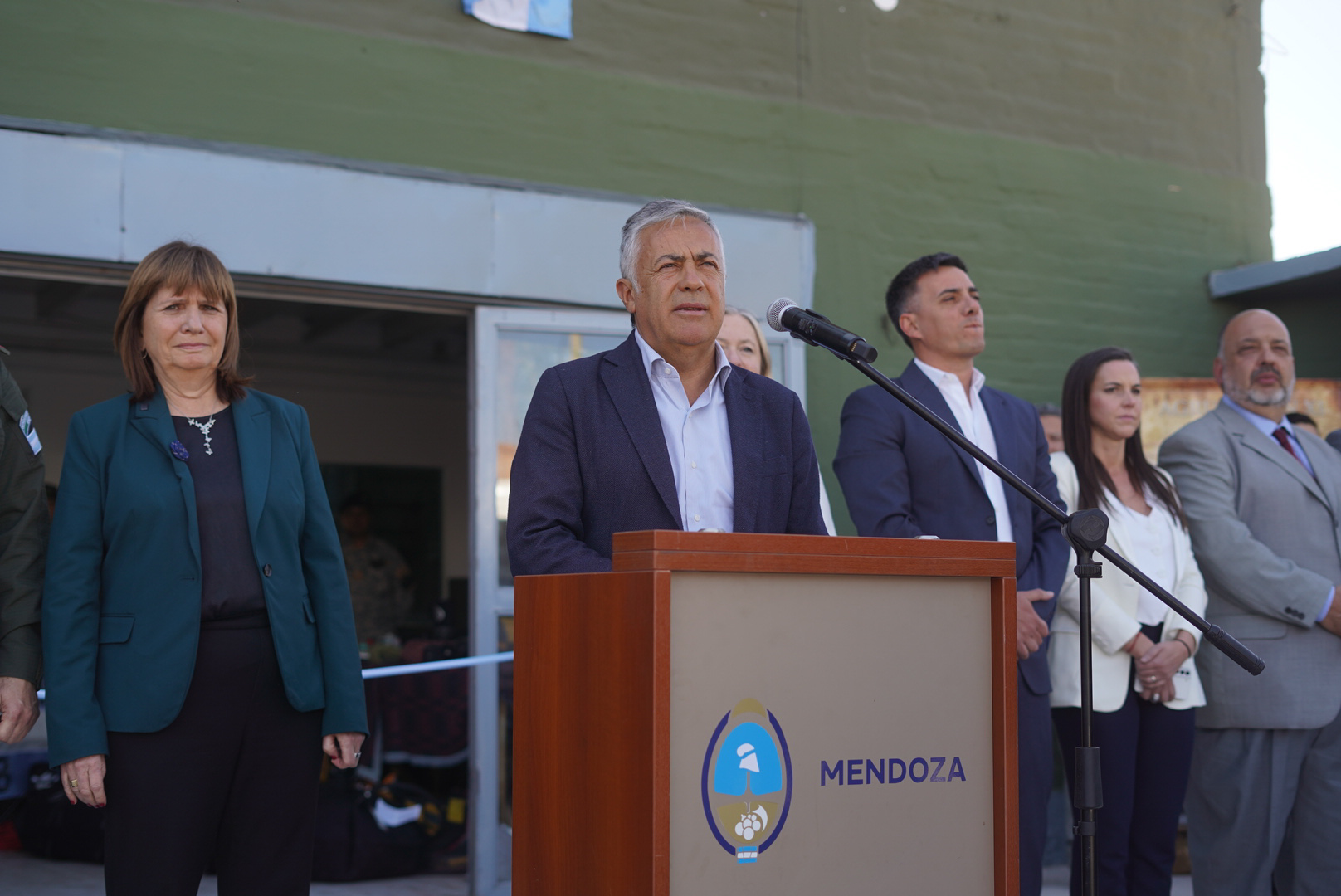 El Gobernador Alfredo Cornejo, junto a la vicegobernadora Hebe Casado; y los ministros nacionales de Seguridad, Patricia Bullrich, y de Defensa, Luis Petri; acompañados por el intendente de Guaymallén, Marcos Calvente, encabezaron dos inauguraciones que fortalecen el sistema de seguridad en la provincia.