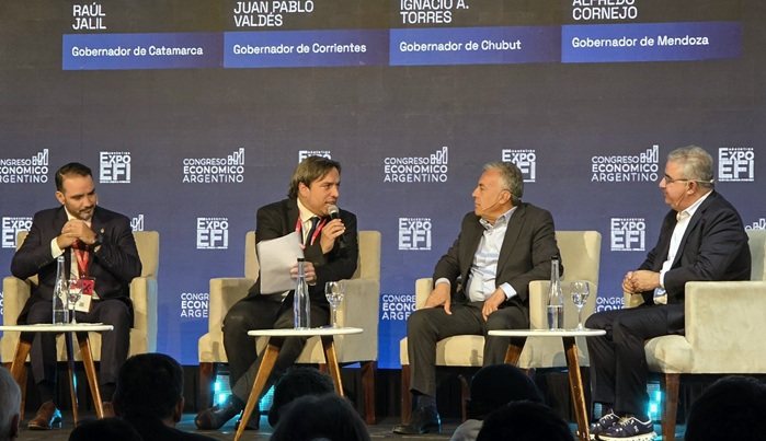 El Gobernador de Mendoza, Alfredo Cornejo, participó en la 13ª edición de Expo EFI, la Convención de Economía, Finanzas e Inversiones que se desarrolla en el Centro de Convenciones de Buenos Aires. Allí compartió el panel “Economía real y transformación productiva: la mirada de las regiones” junto a los gobernadores Raúl Jalil (Catamarca), Ignacio Torres (Chubut) y Juan Pablo Valdés (Corrientes), con la moderación del periodista José Del Río.