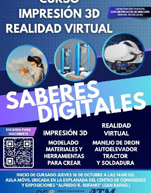 Está organizado por la Dirección General de Escuelas; “Saberes Digitales” es una capacitación con certificación oficial orientada a tecnologías de vanguardia como impresión 3D, realidad virtual, manejo de dron, autoelevador, tractor y soldadura.