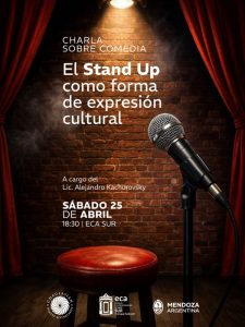 En tanto que el sábado 25 a las 18,30, el licenciado Alejandro Kachurovsky brindará una charla sobre comedia «El Stand Up, una forma de expresión cultural». Cuenta con el apoyo de ECA Sur, Bodega Chaglacián y Gobierno de Mendoza.