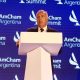 Hombre de cabello gris con traje y corbata hablando en un podio blanco frente a una pantalla azul con logos repetidos de AmChamCornejo coincidió con Frigerio (Maximiliano Luna)