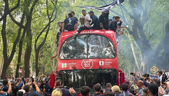 El avión que trasladó al plantel desde Córdoba arribó al Aeropuerto Internacional Gobernador Francisco Gabrielli alrededor de las 13 y de allí la comitiva Leprosa viajó hasta el Estadio Bautista Gargantini en el parque General San Martín, donde una hora después se encontró con los hinchas para celebrar.