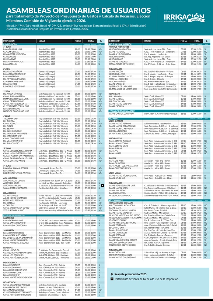 El Departamento General de Irrigación informó que durante los meses de octubre y noviembre se realizarán asambleas ordinarias para la aprobación del presupuesto anual de cálculo gastos y recursos de las Inspecciones de Cauce de toda la provincia, y asambleas extraordinarias de reajustes presupuestarios y distribución del recurso hídrico, dentro del marco de la Resol. N° 744/96 HTA y su modificatoria Resol. N° 294/25 HTA.