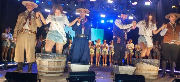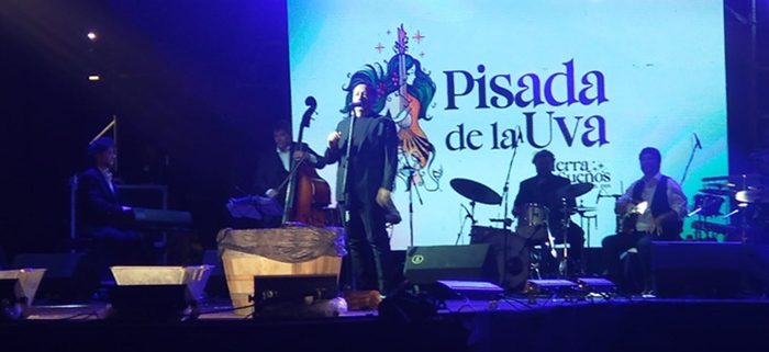 En el paseo Rawson se llevó a cabo una nueva edición de la Pisada de la Uva donde las representantes vendimiales recrearon el histórico método para la transformación del fruto en vino hasta el siglo XIX.