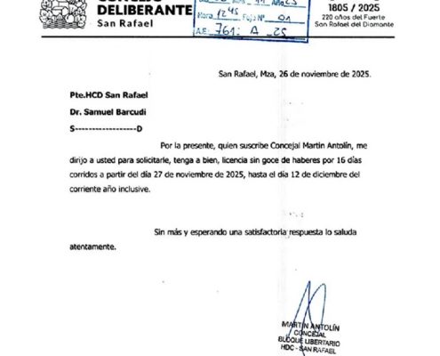 «Por la presente, quien suscribe concejal Martín Antolín, me dirijo a usted para solicitarle, tenga a bien, licencia sin goce de haberes por 16 días corridos a partir del día 27 de noviembre de 2025, hasta el día 12 de diciembre del corriente año inclusive», dice la solicitud que presentó a las 12,45 por Mesa de Entradas del Concejo Deliberante.