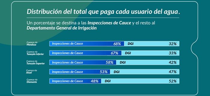 En promedio, el 60% de lo pagado va a las Inspecciones de Cauce y éstas no dependen de Irrigación. Cabe destacar que el organismo del agua es quien distribuye como “mayorista” el agua para todos sus usos, mientras que las Inspecciones de Cauce, lo hacen a nivel “minorista”. Irrigación es responsable de la gestión de los ríos, el manejo de los embalses, la operación de los diques de derivación y los canales primarios. A través de sus Subdelegaciones controla la operación del sistema y distribuye el agua a las Inspecciones de Cauce.