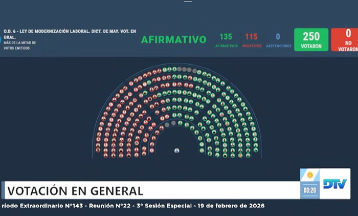 A las 0,30 de este viernes la Cámara de Diputados de la nación, tras una sesión que tuvo varios ribetes escandalosos, comenzó con la votación y se aprobó en general la Reforma laboral; la sesión finalizó con la aprobación de los títulos a las 2.03 de este viernes.