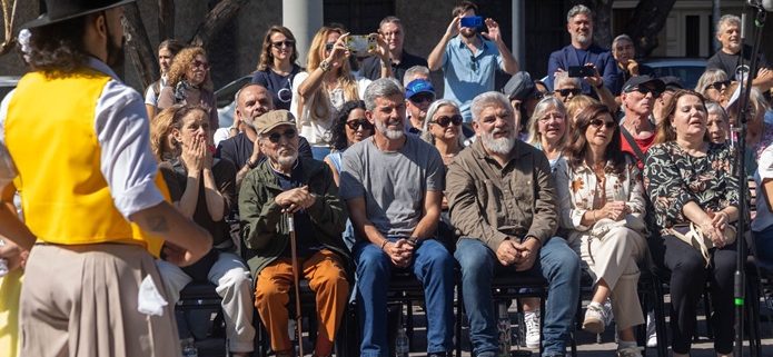 La ceremonia comenzó con la sorpresiva participación del Coro de la Ciudad de Mendoza, dirigido por Eleonora Fernández, interpretando la memorable canción “Otoño en Mendoza”, a capella, mientras avanzaban hacia el espacio del acto, generando una apertura profundamente emotiva. Pero mientras este cuadro terminaba siguieron las sorpresas con la grata aparición del actor Darío Anís, quien caracterizado como cartero, ofreció un relato sobre la vida y obra del cantor, aportando una mirada sensible y narrativa al homenaje.