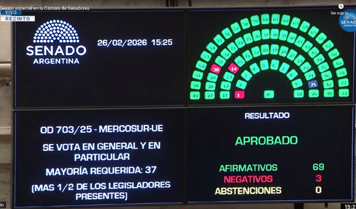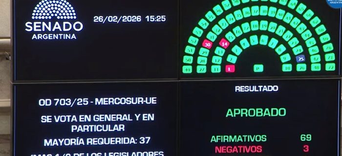 El Senado de la Nación aprobó por 69 votos a favor y 3 en contra el acuerdo Unión Europea-Mercosur. Luego de cuatro horas de debate en donde los senadores de La Libertad Avanza tuvieron una baja participación, el peronismo fue pasando uno a uno sus legisladores señalando el apoyo pero con críticas al Gobierno nacional, su política en lo referente a los tratados internacionales y a su política económica.